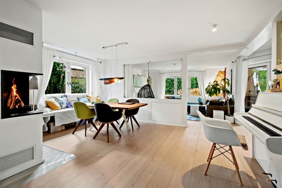 Schon beim Betreten des Hauses spüren Sie ein behagliches Wohlgefühl, das auf einen guten Grundriss, eine geschmackvolle, hochwertige Ausstattung und viele bodentiefe Fenster zurückzuführen ist. Dreh- und Angelpunkt des Hauses bildet der Wohnbereich mit seinem Kamin und die offene Küche. Die nach Süden ausgerichtete Terrasse lädt bei den ersten Sonnenstrahlen zum Verweilen ein. Hierzu trägt der geschmackvolle Kamin auf der Terrasse bei.